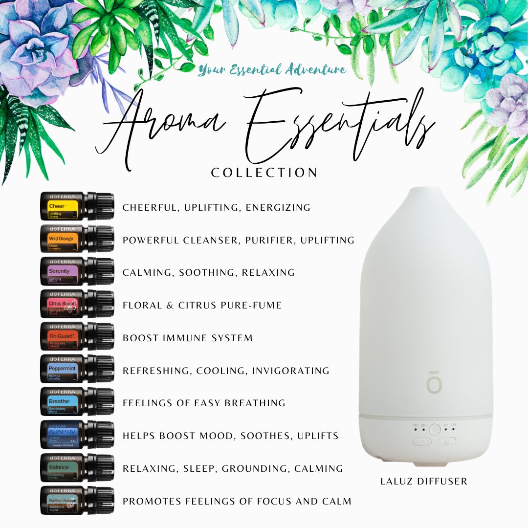The dōTERRA Aroma Essential Collection Kit includes some powerhouse products to help you help create a home that is refreshing, invigorating, full to the brim with lovely aromas, and most importantly - straight from the plant. The kit includes a 5ml bottle of Peppermint, dōTERRA Balance, dōTERRA Breathe, Wild Orange, dōTERRA On Guard, Citrus Bloom, dōTERRA Serenity, dōTERRA Cheer, Adaptiv, Northern Escape and the gorgeous Laluz Diffuser.